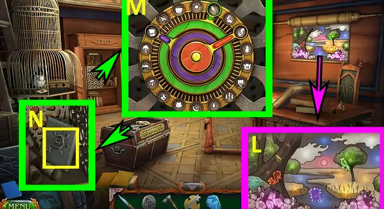 ✔ Click on the tapestry (P) and use the BOTTLE SHARD to find out which ingredient is missing.