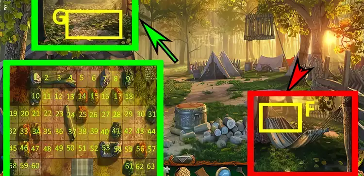 ✔ Press on the fireplace, take the poker (E) and move the coals with it (G).