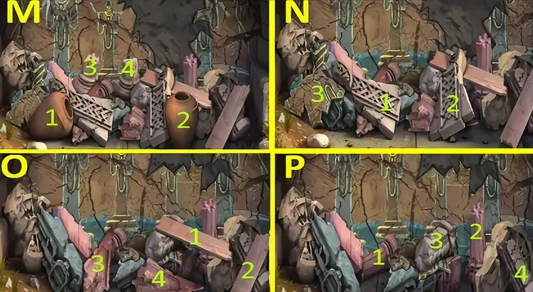 ✔ Press the COLORED GLASS (N) (O) (P) in turn and remember the hint.